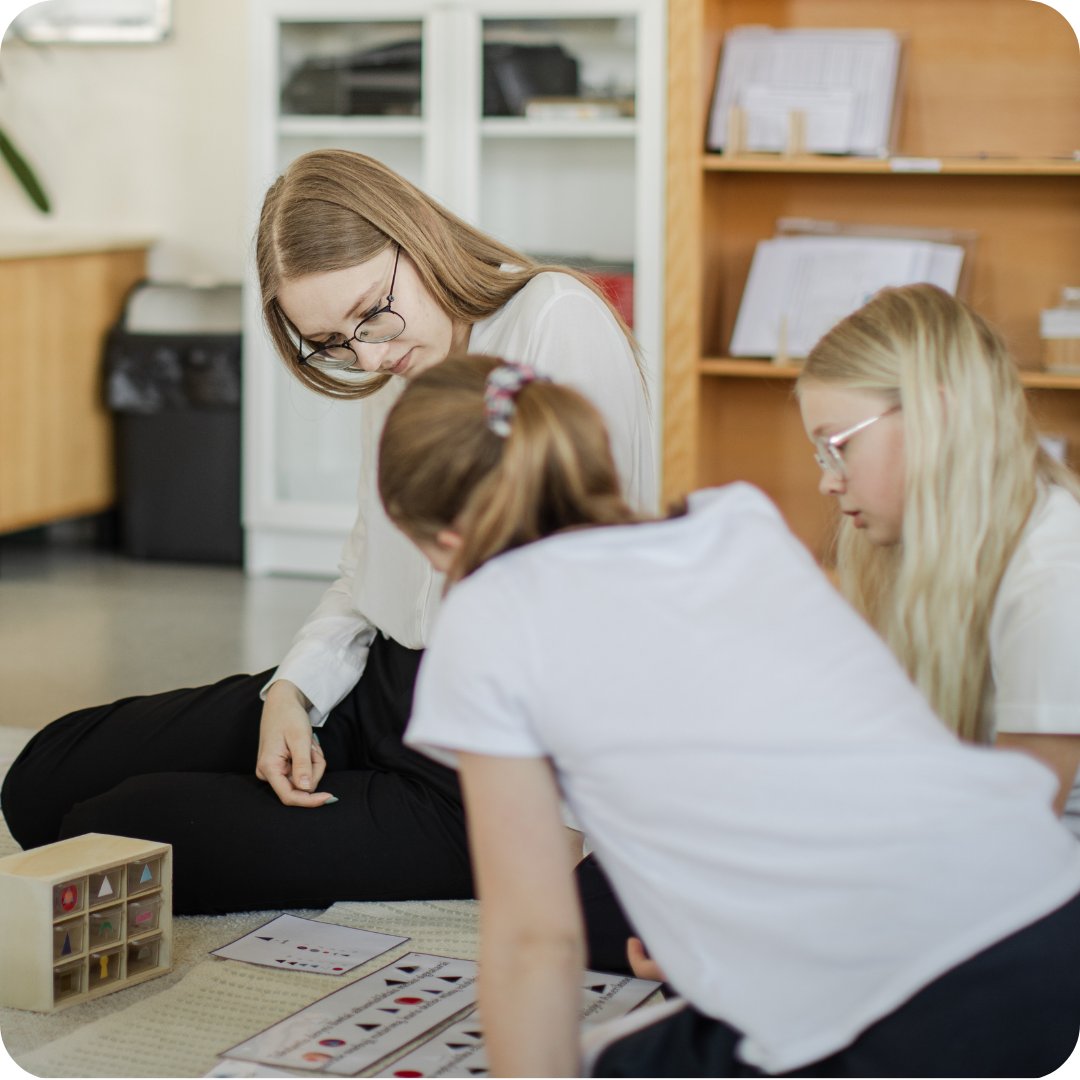 Mokytojas. Mokytojas paruošia aplinką, ją prižiūri ir saugoja. Taip pat padeda vaikui sukurti ryšį su aplinka. Ryšys tarp mokytojo ir vaiko pačioje pradžioje yra gana stiprus, bet laikui bėgant jis silpsta, nes vaiko ryšys su aplinka stiprėja. Mokytojo tikslas yra padėti vaikui sukurti tokį stiprų ryšį su aplinka, kad jam beveik nebereikėtų mokytojo ir jis pats puikiai naudotųsi paruošta aplinka ir save mokytų. Mokytojas pirmenybę turi teikti priemonių pristatymui. Pristatymas turi būti toks, kad vaikui veikla būtų patraukli ir jis norėtų pabandyti pats. Mokytojas kiekvieną dieną turi skirti laiko vaikų ir aplinkos stebėjimui, kad galėtų tinkamai paruošti aplinką, pastebėtų kokią priemonę konkrečiam vaikui reikėtų pristatyti toliau.